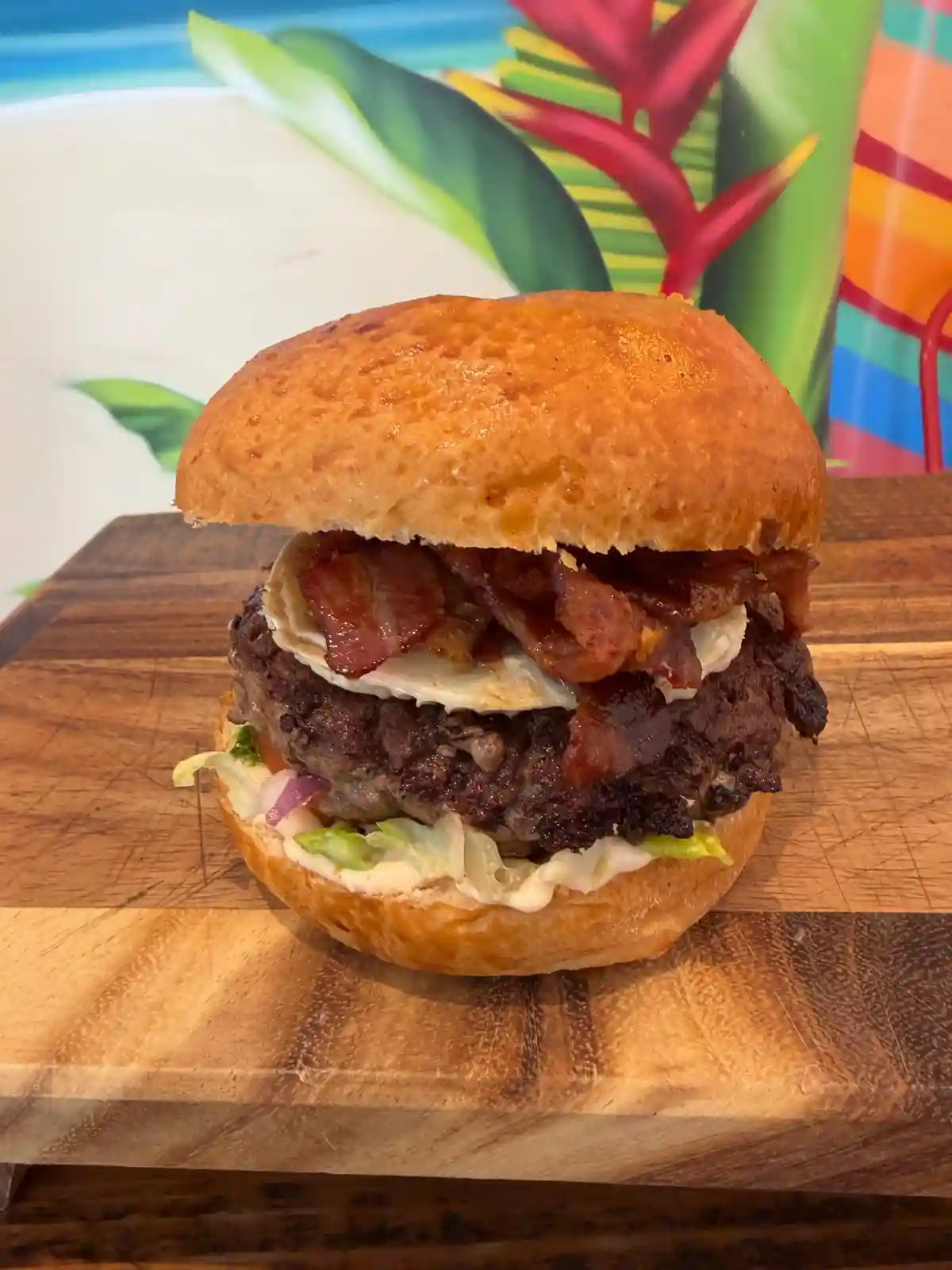 Steak, bacon, cheddar, oignons crus, tomates, pickles, ketchup et moutarde