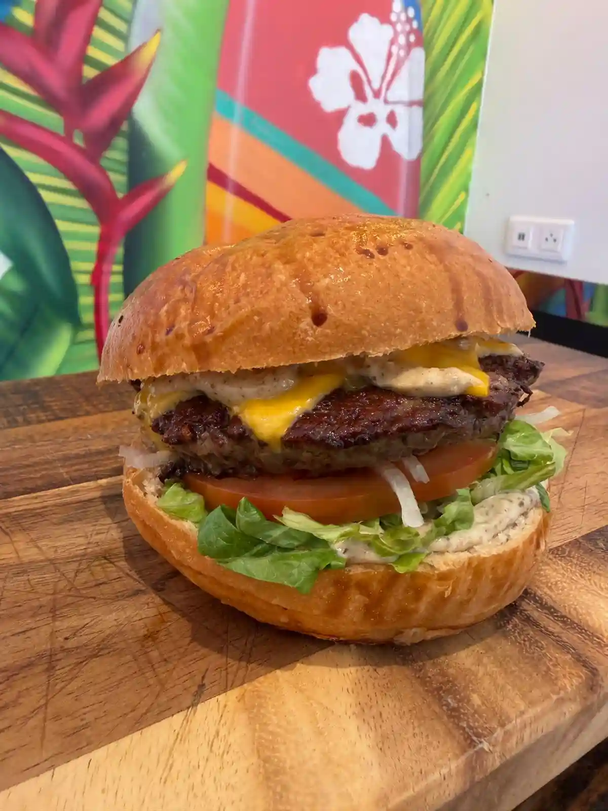 Steak, double cheddar, salade, tomates,…